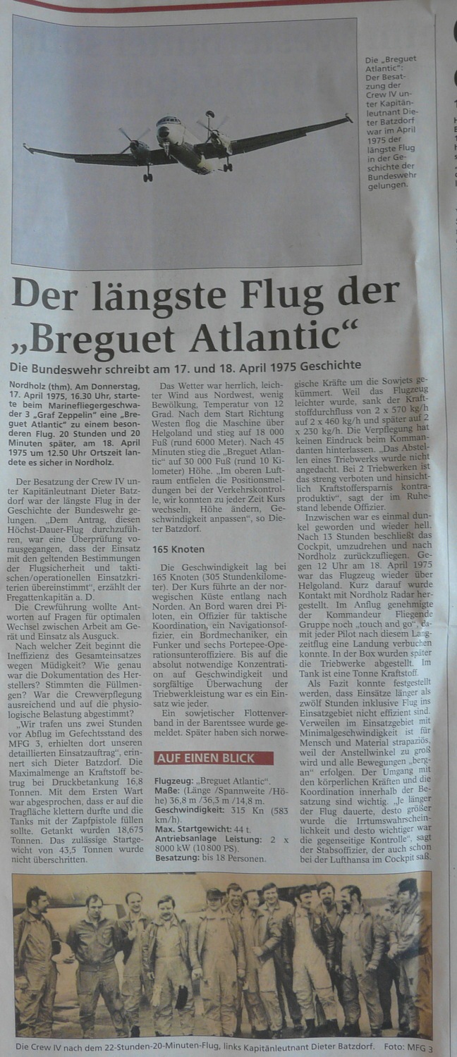 Wie schon im gestrigen Beitrag angekündigt, gibt es heute einen Artikel aus der Nordsee-Zeitung vom 14.09.2009. Da ich inzwischen die Erlaubnis der Nordsee Zeitung habe diesen Ausschnitt zu verwenden, kann man ihn entweder links anklicken und lesen oder aber als pdf-Datei Anschauen, was zum Lesen vielleicht angenehmer ist. Zusätzlich kann ich aber auch hier schon einmal anreißen worum es in dem Artikel geht. Die Überschrifft sagt ja schon fast alles, denn er sagt zum Beispiel nicht das am Ende 20 Stunden und 20 Minuten im Bordbuch standen für diesen einen Flug. Viele Nordholzer kennen diese “Geschichte” bestimmt aber auch mir waren einige Fakten neu. So zum Beispiel das Datum. Das ist in dem Artikel als 17/18.04.1975 angegeben. Ich kannte aus Publikationen des MFG 3 bisher den 25.04.75. Da sich aber der Autor offensichtlich mit Herrn Batzdorf getroffen hat bzw. mit ihm geredet hat, gehe ich mal davon aus das dieses Datum auch stimmt. Ich dachte bisher auch das die Maschine mit einem Triebwerk abgestellt über dem Fliegerhorst gekreist hat. Auch damit wird aufgeräumt in dem Artikel. Die Tatsache das nach der Landung noch eine Tonne Sprit in den Tanks war ist mir hingegen wieder bekannt gewesen. Sogar der Treibstoffdurchfluss ist in dem Artikel angegeben. Anfangs 2×570 kg/h sank er auf 2×460 kg/h und betrug am Ende durch das leichtere Flugzeug nur noch 2×230 kg/h. Da hätte die Tonne Sprit also rechnerisch noch für weitere 2 Stunden gereicht. Die Atlantic ist schon ein erstaunliches Flugzeug. Aber genug vom schwelgen in der Vergangenheit. Auch im jetzt und hier gab es das ein oder andere zu berichten und zu fotografieren. Eigentlich wollte ich zum Flugplatz weil eine P-3 gegen halb sieben landete und ich hoffte sie ablichten zu können. Diese Hoffnung blieb eine solche. Aber es stand, als ich um viertel vor sieben am Flugplatz war, ein EC-135T1 ganz allein auf der Platte. Die Kennung 82+63 im Hirn gespeichert und schnell ein paar Bilder gemacht von denen ich das Beste hier zeige. Damit ist aber auch schon das Maximum an Flugzeugbildern für heute erreicht. Neben dem Hubschrauber habe ich nur noch Bilder des Sonnenuntergangs in Spieka-Neufeld zu bieten. Da ich mit bei diesen aber genauso viel Mühe gegeben habe wie bei Flugzeugbildern, denke ich das sie Zeigens- und Sehenswert sind.