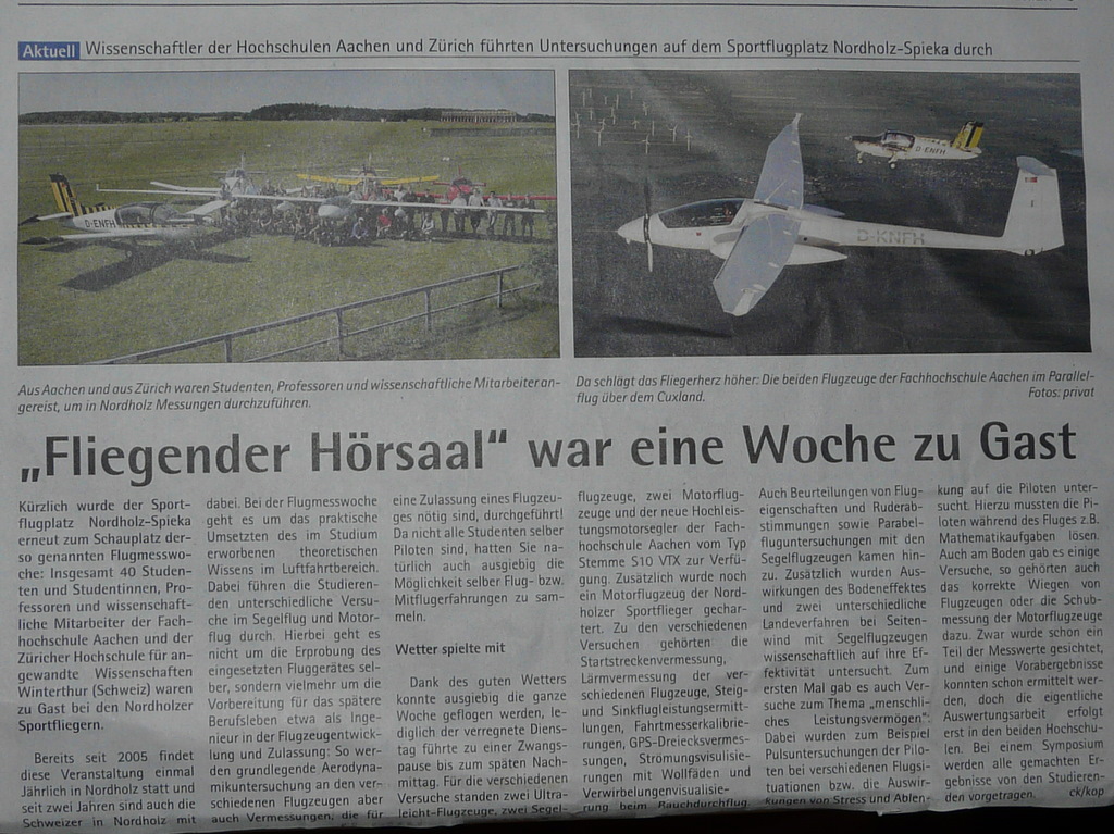 Nicht nur heute, schon die ganze Woche war Flugbetrieb in Nordholz. Nicht aber wie man denken würde durch das MFG 3, sondern durch die Sportfluggruppe bzw. durch ihre Gäste aus Zürich und Aachen. Bei den Gästen handelt es sich um Professoren, wissenschaftliche Mitarbeiter und Studenten der Fachhochschule Aachen und der Züricher Hochschule für angewandte Wissenschaften Winterthur. Bis zum heutigen Tag hatte ich nie wirklich Zeit und Ruhe gefunden Fotos zu machen. Aber heute hat dann alles gepasst. So habe ich mir meine Kamera geschnappt und versucht interessante Bilder zu machen. Zumindest ein paar der Bilder haben auch bei den Teilnehmern aus der Schweiz anklang gefunden. Manche der Bilder sind nicht gestochen scharf und manche rauschen auch relativ stark. Das liegt natürlich an der Kamera aber auch an der Tatsache, das die Flugmesswoche hauptsächlich früh am morgen oder spät am Abend stattfindet. Für viele der Versuche oder Tests benötigt man einfach ruhige Luft und das ist eben hauptsächlich zu diesem Zeiten gegeben. Den Anfang in der Bilderserie macht die DG-1000 die von der Do-27 der Sportfluggruppe auf Höhe geschleppt wurde. Interessanterweise saß am Steuerknüppel ein Pilot aus Nordholz und noch interessanter ist das er diesen, sehr lesenswerten Artikel, in einer lokalen Zeitung geschrieben hat. Man könnte also auch sagen das der Mann weiß wovon er schreibt. Auf dieser Seite der Sportfluggruppe Nordholz gibt es eine Bildergalerie in der man genau diesen DG 1000 Flug aus der Onboard-Perspektive verfolgen kann. Da kann man dann auch noch mal mein Formationsbild mittendrin sehen. Als nächstes startete die Stemme S-10, wie ich finde ein sehr elegantes Flugzeug. Wie man in dem “Historischem Dokument” sehen kann, hatte ich vor langer Zeit schon einmal das Vergnügen mitzufliegen. Mir hat es schon ganz gut gefallen. Wenn schon ein Motorsegler dann mit Gleitwinkel 1:50. Besonders faszinierend fand ich die Verwirbelungenvisualisierung. So etwas hatte ich bisher nur im TV gesehen aber real ist es natürlich um ein vielfaches beeindruckender. Das Bild das die DG 1000 in unmöglicher Fluglage zeigt ist nicht nur falsch gedreht hochgeladen. Das ist tatsächlich so, fast senkrecht nach oben fotografiert. Das Flugzeug steht quasi auf der Fläche direkt über mir. Und das alles genau über meiner Haustür, danke dafür Herr Pilot. Ich hoffe Bilder und Bericht gefallen. Der Artikel gibt noch etwas mehr Einblick und warum soll ich das noch einmal schreiben, wenn es jemand schon sehr gut getan hat.
